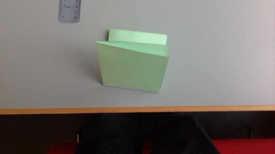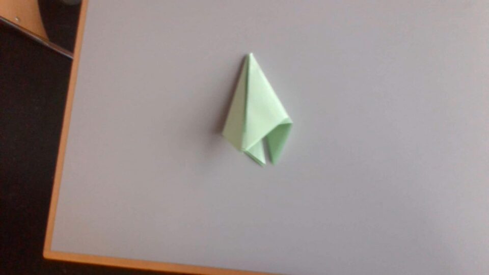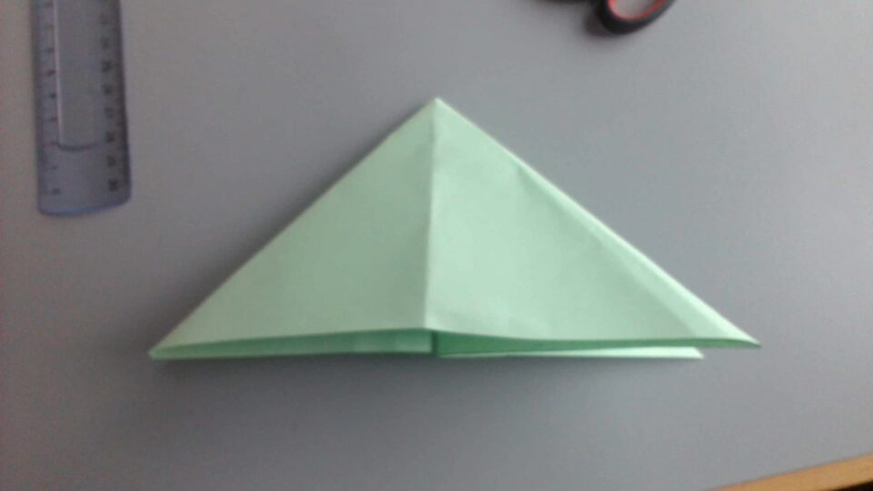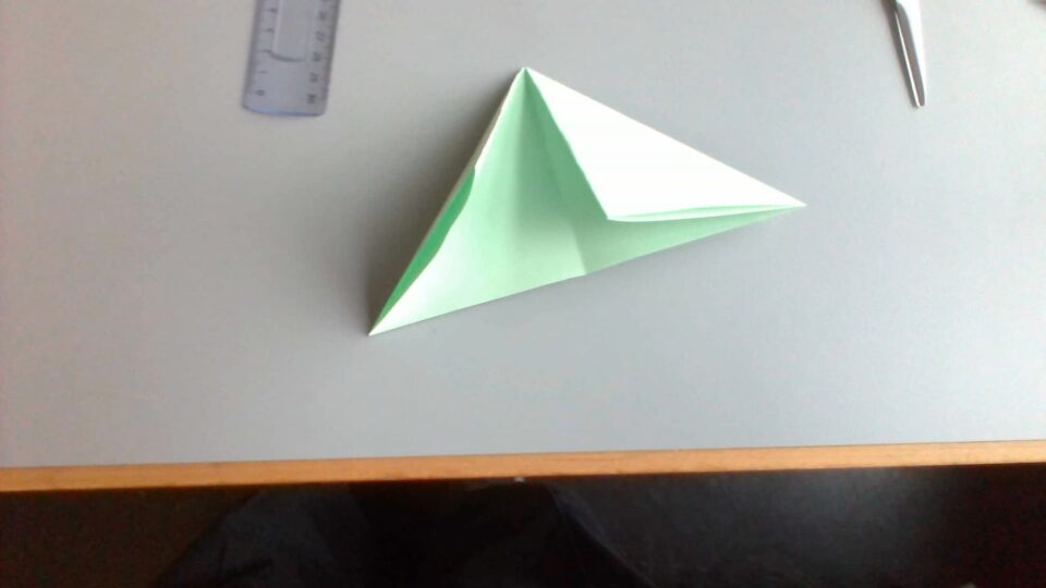 Einmal öffnen, offene Kante unten, beide obere Spitzen in die Mitte falten. Alles wieder auseinanderfalten und einmal das ganze Papier wenden. Falte dann die Aussenseiten nach innen auf ein übereinanderliegendes Dreieck.
