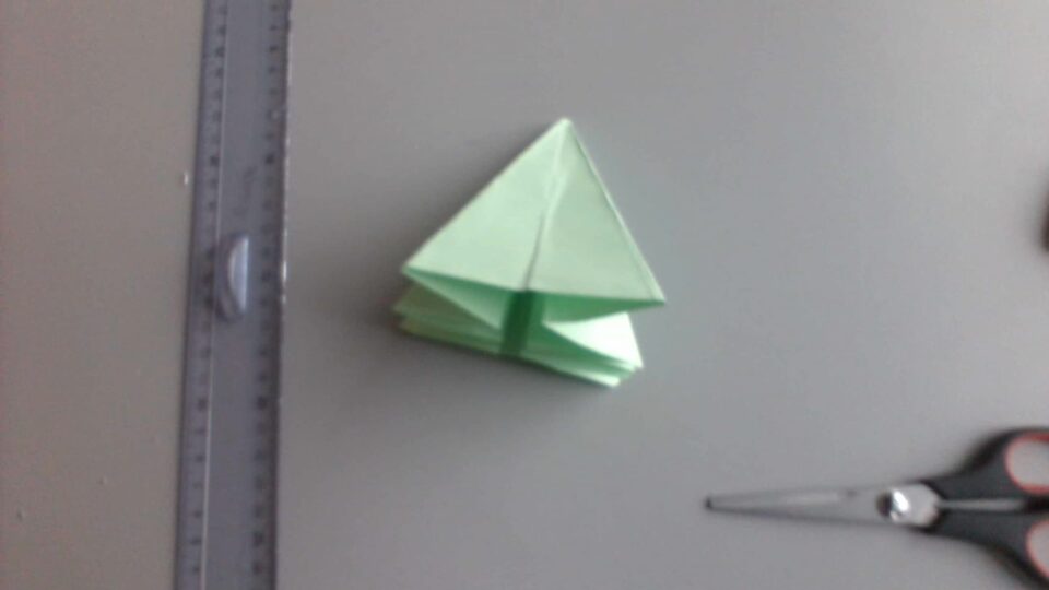 Jetzt die Spitzen nach innen schlagen, wieder öffnen und auf die Hälfte falten, das gleiche auf die andere Seite. Das gleiche dann nochmal auf der Rückseite wiederholen. Unten alle Spitzen abschneiden bis auf die Blattlinie.